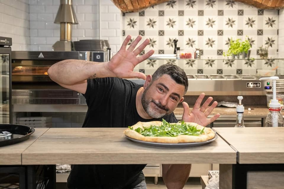 z sosem z pomidorów pelati, mozzarella Fior di Latte, krewetkami z nutą czosnku, natką, pancettą (boczek dojrzewający) i pomidorkami cherry -